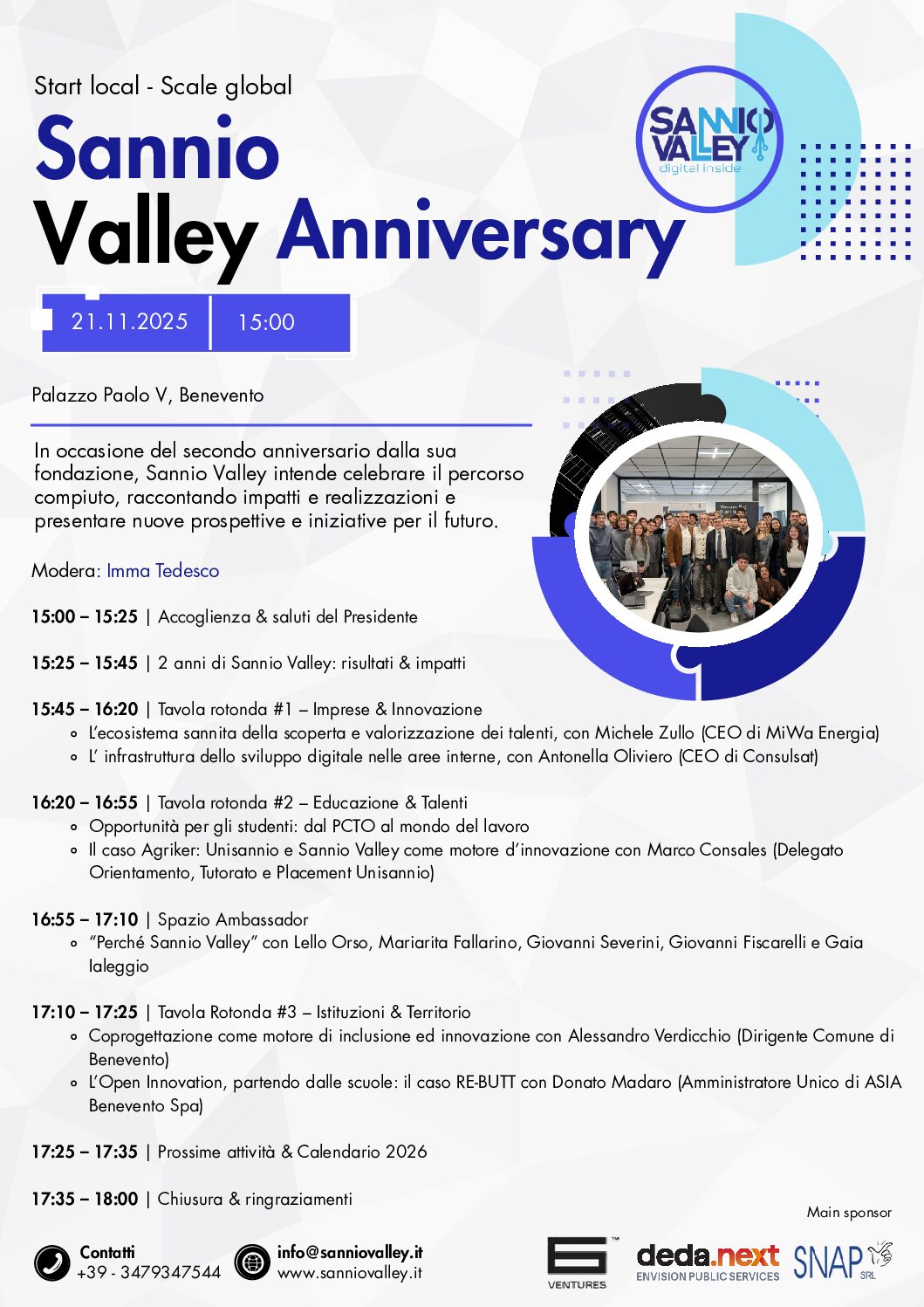 “Sannio Valley Anniversary: Start Local. Scale Global”, è il titolo dell’evento che si terrà venerdì 21 novembre 2025, dalle 15:00...